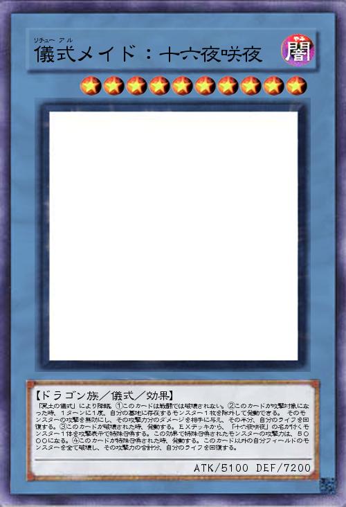 | 「冥土の儀式」により降臨。①このカードは戦闘では破壊されない。②このカードが攻撃対象になった時、1ターンに1度、自分の墓地に存在するモンスター1枚を除外して発動できる。 そのモンスターの攻撃を無効にし、その攻撃力分のダメージを相手に与え、その半分、自分のライフを回復する。③このカードが破壊された時、発動する。EXデッキから、「十六夜咲夜」の名が付くモンスター1体を攻撃表示で特殊召喚する。この効果で特殊召喚されたモンスターの攻撃力は、5000になる。④このカードが特殊召喚された時、発動する。このカード以外の自分フィールドのモンスターを全て破壊し、その攻撃力の合計分、自分のライフを回復する。 | |||