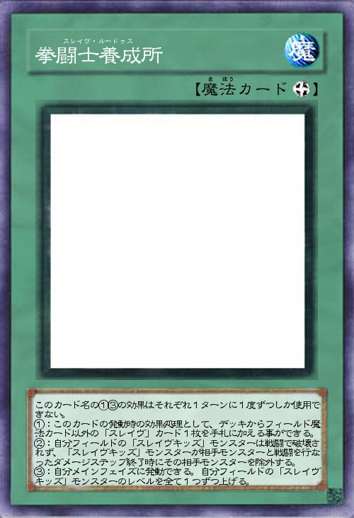 | このカード名の①③の効果はそれぞれ1ターンに1度ずつしか使用できない。 ①:このカードの発動時の効果処理として、デッキからフィールド魔法カード以外の「スレイヴ」カード1枚を手札に加える事ができる。 ②:自分フィールドの「スレイヴキッズ」モンスターは戦闘で破壊されず、「スレイヴキッズ」モンスターが相手モンスターと戦闘を行なったダメージステップ終了時にその相手モンスターを除外する。 ③:自分メインフェイズに発動できる。自分フィールドの「スレイヴキッズ」モンスターのレベルを全て1つずつ上げる。 | |||