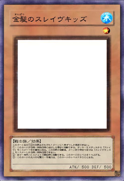 | このカード名の①②の効果はそれぞれ1ターンに1度ずつしか使用できない。 ①:このカードが召喚・特殊召喚に成功した場合に発動できる。デッキ・EXデッキから「スレイヴ」モンスター1体を墓地に送る。この効果の発動後、ターン終了時まで自分は「スレイヴキッズ」モンスターしか召喚・特殊召喚できない。 ②:自分・相手バトルフェイズ開始時に発動できる。このカードのレベルを1つ上げる。 ③:このカードの元々の攻撃力・守備力は、このカードのレベル×500となる。 | |||