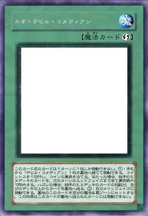 | このカード名のカードは1ターンに1枚しか発動できない。①:手札から「デビル・コメディアン」1枚を墓地へ捨てて発動できる。コイントスを1回行い、コインの裏表を当てる。当たった場合、相手のEXデッキのカードを、次のターンのエンドフェイズまで全て裏側表示で除外する。ハズレの場合、相手のEXデッキのカードの枚数分、自分のデッキの上からカードを墓地へ送る。②:自分メインフェイズに発動できる。墓地のこのカードを自分の魔法&罠ゾーンにセットする。この効果はこのカードが墓地へ送られたターンには発動できない。 | |||