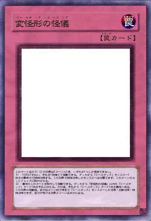 | このカード名の(1)(2)の効果は1ターンに1度、いずれか1つしか使用できない。 (1):1000LPを払い、手札を1枚捨てて発動できる。デッキから「ドールテック」モンスター1体を攻撃表示で特殊召喚する。この効果で特殊召喚したモンスターは攻撃できず、このターンのエンドフェイズに除外される。 (2):墓地のこのカードを除外して発動できる。デッキから「変怪形の怪儀」以外の「ドールテック」カード1枚を手札に加える。その後、手札から「ドールテック」カード1枚を墓地へ送る。この効果の発動後、自分はターン終了時まで「ドールテック」モンスターしか召喚・反転召喚・特殊召喚できず、自分が受ける効果ダメージは半分になる。 | |||