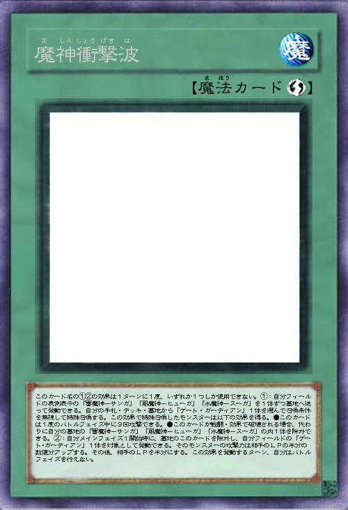 | このカード名の①②の効果は1ターンに1度、いずれか1つしか使用できない。①:自分フィールドの表側表示の「雷魔神-サンガ」「風魔神-ヒューガ」「水魔神-スーガ」を1体ずつ墓地へ送って発動できる。自分の手札・デッキ・墓地から「ゲート・ガーディアン」1体を選んで召喚条件を無視して特殊召喚する。この効果で特殊召喚したモンスターは以下の効果を得る。●このカードは1度のバトルフェイズ中に3回攻撃できる。●このカードが戦闘・効果で破壊される場合、代わりに自分の墓地の「雷魔神-サンガ」「風魔神-ヒューガ」「水魔神-スーガ」の内1体を除外できる。②:自分メインフェイズ1開始時に、墓地のこのカードを除外し、自分フィールドの「ゲート・ガーディアン」1体を対象として発動できる。そのモンスターの攻撃力は相手のLPの半分の数値分アップする。その後、相手のLPを半分にする。この効果を発動するターン、自分はバトルフェイズ | |||
