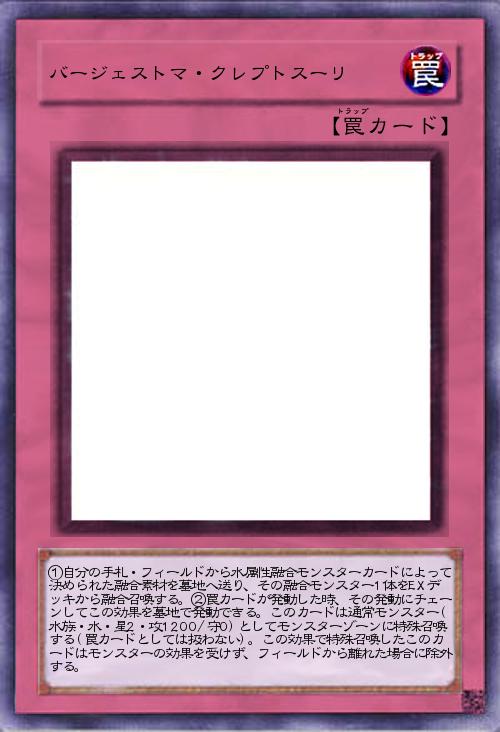 | ①自分の手札・フィールドから水属性融合モンスターカードによって決められた融合素材を墓地へ送り、その融合モンスター1体をEXデッキから融合召喚する。②罠カードが発動した時、その発動にチェーンしてこの効果を墓地で発動できる。このカードは通常モンスター(水族・水・星2・攻1200/守0)としてモンスターゾーンに特殊召喚する(罠カードとしては扱わない)。この効果で特殊召喚したこのカードはモンスターの効果を受けず、フィールドから離れた場合に除外する。 | |||
