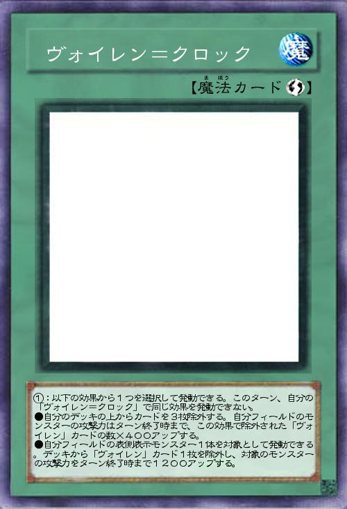 | ①:以下の効果から1つを選択して発動できる。このターン、自分の「ヴォイレン=クロック」で同じ効果を発動できない。 ●自分のデッキの上からカードを3枚除外する。自分フィールドのモンスターの攻撃力はターン終了時まで、この効果で除外された「ヴォイレン」カードの数×400アップする。 ●自分フィールドの表側表示モンスター1体を対象として発動できる。デッキから「ヴォイレン」カード1枚を除外し、対象のモンスターの攻撃力をターン終了時まで1200アップする。 | |||
