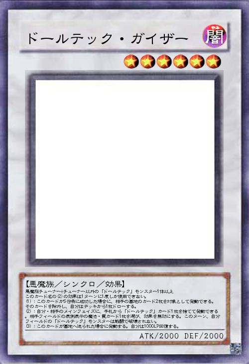 | 悪魔族チューナー+チューナー以外の「ドールテック」モンスター1体以上 このカード名の(2)の効果は1ターンに1度しか使用できない。 (1):このカードがS召喚に成功した場合に、相手の墓地のカード2枚を対象として発動できる。そのカードを除外し、自分はデッキから1枚ドローする。 (2):自分・相手のメインフェイズに、手札から「ドールテック」カード1枚を捨てて発動できる。相手フィールドの表側表示の魔法・罠カード1枚を選び、効果を無効にする。このターン、自分フィールドの「ドールテック」モンスターは戦闘で破壊されない。 (3):このカードが墓地へ送られた場合に発動する。自分は1000LP回復する。 | |||
