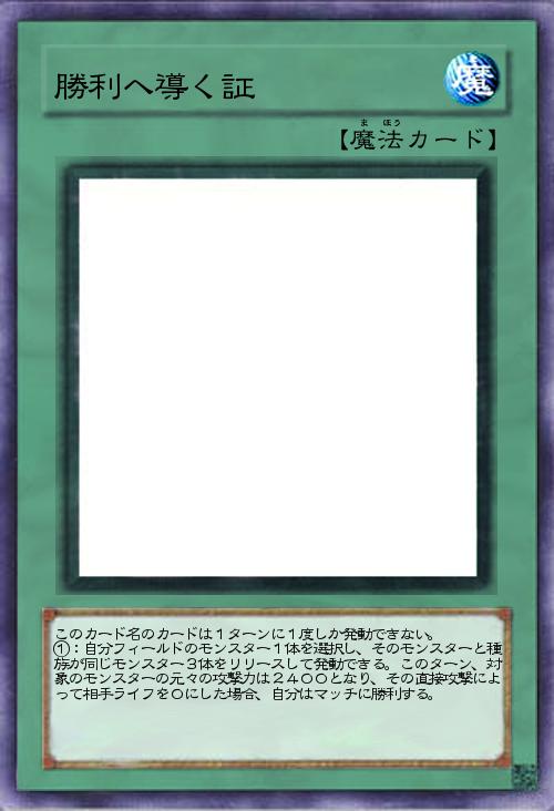 | このカード名のカードは1ターンに1度しか発動できない。 ①:自分フィールドのモンスター1体を選択し、そのモンスターと種族が同じモンスター3体をリリースして発動できる。このターン、対象のモンスターの元々の攻撃力は2400となり、その直接攻撃によって相手ライフを0にした場合、自分はマッチに勝利する。 | |||