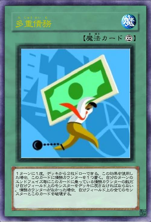 | 1ターンに1度、デッキから2枚ドローできる。この効果を使用した場合、このカードに債務カウンターを1つ置く。自分のターンのエンドフェイズ毎にこのカードに乗っている債務カウンターの数だけ自分フィールド上のモンスターをデッキに戻さなければならない。債務カウンターがなかった場合、自分フィールド上の全てのモンスターとこのカードを破壊する。 | |||