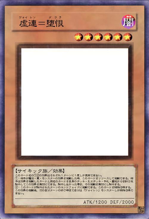 | このカード名の①②の効果はそれぞれ1ターンに1度しか使用できない。 ①:相手が魔法・罠・モンスターの効果を発動した時、このカードをリリースして発動できる。相手は効果を発動したカードと同名のカードを自身のデッキ・EXデッキ・手札・墓地から合計2枚除外してこの効果を無効にできる。除外しなかった場合、その発動を無効にし除外する。 ②:このカードが除外されたターンのエンドフェイズに発動できる。このカードを特殊召喚する。この効果の発動後、次の自分ターンの終了時まで自分は「ヴォイレン」モンスターしか特殊召喚できない。 | |||