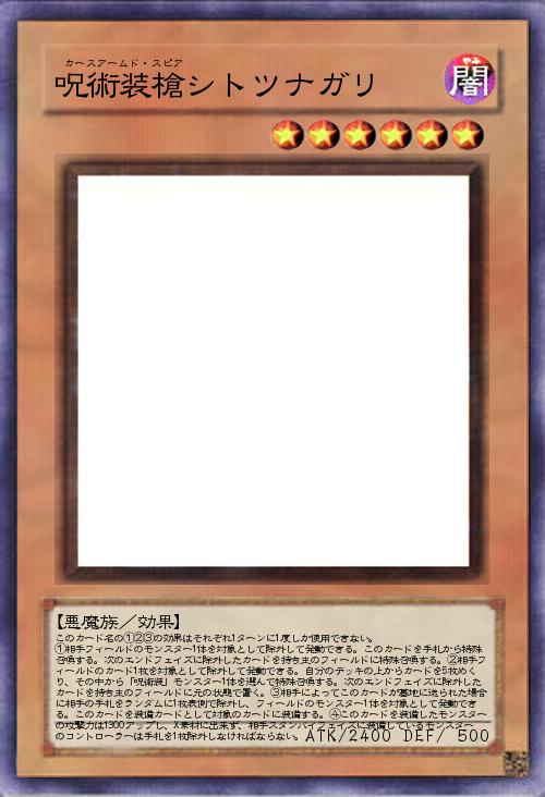 | このカード名の①②③の効果はそれぞれ1ターンに1度しか使用できない。 ①相手フィールドのモンスター1体を対象として除外して発動できる。このカードを手札から特殊召喚する。次のエンドフェイズに除外したカードを持ち主のフィールドに特殊召喚する。②相手フィールドのカード1枚を対象として除外して発動できる。自分のデッキの上からカードを5枚めくり、その中から「呪術装」モンスター1体を選んで特殊召喚する。次のエンドフェイズに除外したカードを持ち主のフィールドに元の状態で置く。③相手によってこのカードが墓地に送られた場合に相手の手札をランダムに1枚表側で除外し、フィールドのモンスター1体を対象として発動できる。このカードを装備カードとして対象のカードに装備する。④このカードを装備したモンスターの攻撃力は1300アップし、X素材に出来ず、相手スタンバイフェイズに装備しているモンスターのコントローラーは手札を | |||