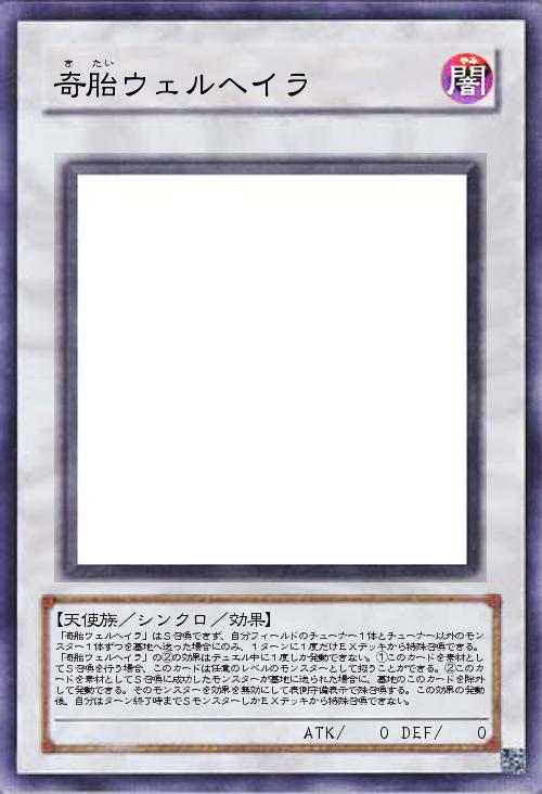 | 「奇胎ウェルヘイラ」はS召喚できず、自分フィールドのチューナー1体とチューナー以外のモンスター1体ずつを墓地へ送った場合にのみ、1ターンに1度だけEXデッキから特殊召喚できる。「奇胎ウェルヘイラ」の②の効果はデュエル中に1度しか発動できない。①このカードを素材としてS召喚を行う場合、このカードは任意のレベルのモンスターとして扱うことができる。②このカードを素材としてS召喚に成功したモンスターが墓地に送られた場合に、墓地のこのカードを除外して発動できる。そのモンスターを効果を無効にして表側守備表示で殊召喚する。この効果の発動後、自分はターン終了時までSモンスターしかEXデッキから特殊召喚できない。 | |||