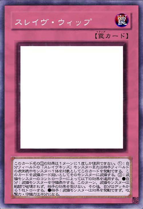 | このカード名の②の効果は1ターンに1度しか使用できない。①:自分フィールドの「スレイヴキッズ」モンスターまたは相手フィールドの表側表示モンスター1体を対象としてこのカードを発動できる。このカードを装備カード扱いとしてそのモンスターに装備する。②:装備モンスターのコントローラーによって以下の効果を適用する。●自分:装備モンスターを守備表示する。このターン、装備モンスターは戦闘で破壊されず、相手の効果を受けない。その後、自分はデッキから1枚ドローする。●相手:装備モンスターは効果を発動できず、攻撃力・守備力は半分になる。 | |||
