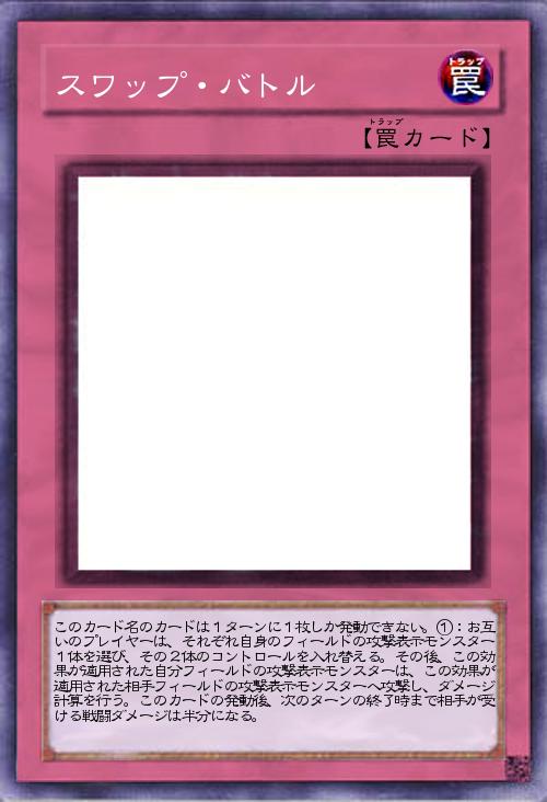 | このカード名のカードは1ターンに1枚しか発動できない。①:お互いのプレイヤーは、それぞれ自身のフィールドの攻撃表示モンスター1体を選び、その2体のコントロールを入れ替える。その後、この効果が適用された自分フィールドの攻撃表示モンスターは、この効果が適用された相手フィールドの攻撃表示モンスターへ攻撃し、ダメージ計算を行う。このカードの発動後、次のターンの終了時まで相手が受ける戦闘ダメージは半分になる。 | |||