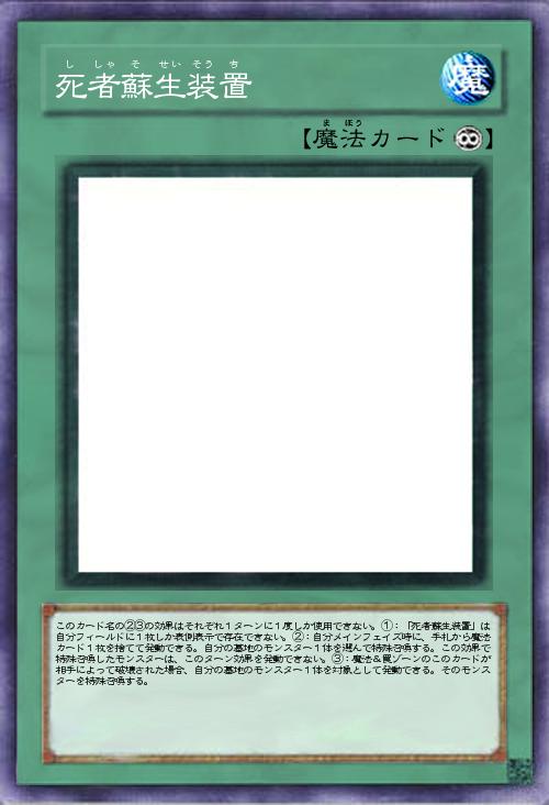 | このカード名の②③の効果はそれぞれ1ターンに1度しか使用できない。①:「死者蘇生装置」は自分フィールドに1枚しか表側表示で存在できない。②:自分メインフェイズ時に、手札から魔法カード1枚を捨てて発動できる。自分の墓地のモンスター1体を選んで特殊召喚する。この効果で特殊召喚したモンスターは、このターン効果を発動できない。③:魔法&罠ゾーンのこのカードが相手によって破壊された場合、自分の墓地のモンスター1体を対象として発動できる。そのモンスターを特殊召喚する。 | |||