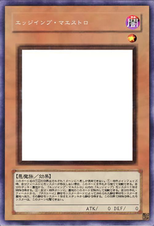 | このカード名の①②の効果はそれぞれ1ターンに1度しか使用できない。①:相手メインフェイズ時、自分フィールドにモンスターが存在しない場合、このカードを手札から捨てて発動できる。自分のデッキ・墓地から、「エッジインプ・マエストロ」以外の「エッジインプ」モンスター1体を特殊召喚する。②:自分・相手ターンに、墓地のこのカードを除外して発動できる。自分の手札・フィールドから、「デストーイ」融合モンスターカードによって決められた融合素材モンスターを墓地へ送り、その融合モンスター1体をEXデッキから融合召喚する。この効果で特殊召喚したモンスターは、このターン攻撃できない。 | |||