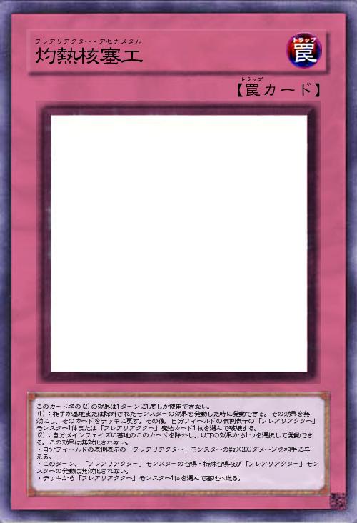 | このカード名の(2)の効果は1ターンに1度しか使用できない。 (1):相手が墓地または除外されたモンスターの効果を発動した時に発動できる。その効果を無効にし、そのカードをデッキに戻す。その後、自分フィールドの表側表示の「フレアリアクター」モンスター1体または「フレアリアクター」魔法カード1枚を選んで破壊する。 (2):自分メインフェイズに墓地のこのカードを除外し、以下の効果から1つを選択して発動できる。この効果は無効化されない。 ・自分フィールドの表側表示の「フレアリアクター」モンスターの数×200ダメージを相手に与える。 ・このターン、「フレアリアクター」モンスターの召喚・特殊召喚及び「フレアリアクター」モンスターの発動は無効化されない。 ・デッキから「フレアリアクター」モンスター1体を選んで墓地へ送る。 | |||