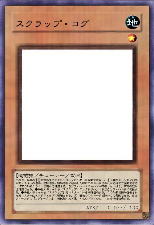 | このカード名の①②の効果はそれぞれ1ターンに1度しか発動できない。①:相手ターン中に相手がモンスターの召喚・反転召喚・特殊召喚に成功した時にこのカードを手札から捨てて発動できる。以下の効果から1つを選んで適用する。自分フィールドにカードが存在しない場合、両方の効果を適用できる。●手札・デッキから「スクラップ・ファクトリー」1枚を自分フィールドに発動する。●手札・デッキから「スクラップ」モンスター1体を特殊召喚する。この効果で特殊召喚されたモンスターはエンドフェイズに破壊される。②:墓地のこのカードを除外して発動できる。自分フィールドに「コグトークン」(機械族・地・星1・攻0/守100)1体を特殊召喚する。 | |||