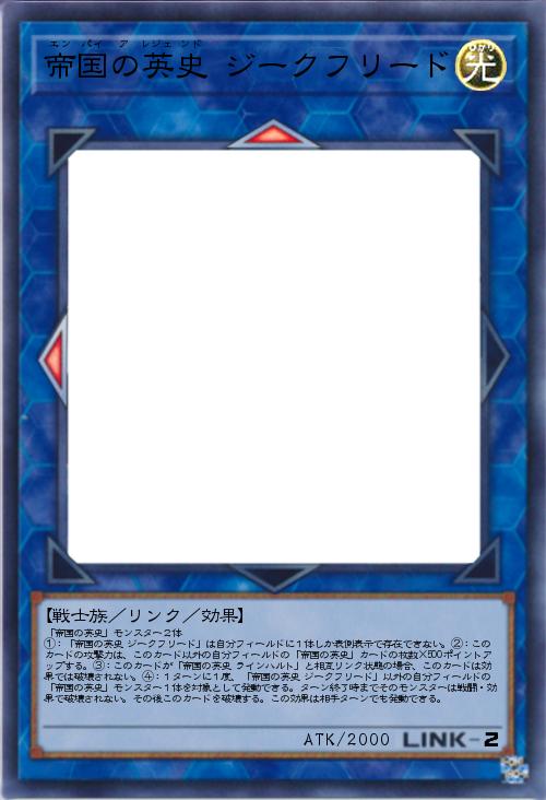 | 「帝国の英史」モンスター2体 ①:「帝国の英史 ジークフリード」は自分フィールドに1体しか表側表示で存在できない。②:このカードの攻撃力は、このカード以外の自分フィールドの「帝国の英史」カードの枚数×500ポイントアップする。③:このカードが「帝国の英史 ラインハルト」と相互リンク状態の場合、このカードは効果では破壊されない。④:1ターンに1度、「帝国の英史 ジークフリード」以外の自分フィールドの「帝国の英史」モンスター1体を対象として発動できる。ターン終了時までそのモンスターは戦闘・効果で破壊されない。その後このカードを破壊する。この効果は相手ターンでも発動できる。 | |||