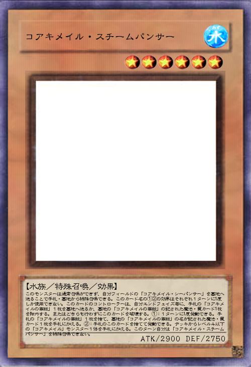 | このモンスターは通常召喚ができず、自分フィールドの「コアキメイル・シーパンサー」を墓地へ送ることで手札・墓地から特殊召喚できる。このカード名の①②の効果はそれぞれ1ターンに1度しか使用できない。このカードのコントローラーは、自分エンドフェイズ毎に、手札の「コアキメイルの鋼核」1枚を墓地へ送るか、墓地の「コアキメイルの鋼核」の記された魔法・罠カード1枚を除外する。またはどちらも行わずにこのカードを破壊する。①:1ターンに1度発動できる。手札の「コアキメイルの鋼核」1枚を捨て、墓地の「コアキメイルの鋼核」の名が記された魔法・罠カード1枚を手札に加える。②:手札のこのカードを捨てて発動できる。デッキからレベル4以下の「コアキメイル」モンスター1体を手札に加える。このターン自分は「コアキメイル・スチームパンサー」を特殊召喚できない。 | |||