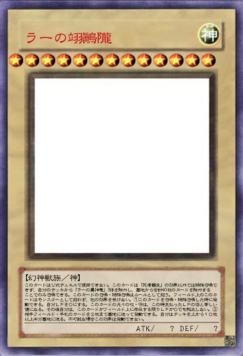 | このカードは公式デュエルで使用できない。このカードは「死者蘇生」の効果以外では特殊召喚できず、自分のデッキから「ラーの翼神竜」3体を除外し、墓地から合計40枚のカードを除外することでのみ召喚できる。このカードの召喚・特殊召喚はルールとして扱う。フィールド上のこのカードはモンスターとして扱わず、他の効果を受けない。①このカードを召喚・特殊召喚した時に発動できる。自分LPを0にする。このカードの元々の攻・守は、この時支払ったLPの倍と等しい値になる。その後自分は、このカードがフィールド上に存在する限りLPが0でも敗北しない。②相手フィールド・手札のカードを2枚まで墓地に送って発動できる。自分はデッキを上から10枚以上半分墓地に送る。不可能な場合この効果は発動できない。 | |||