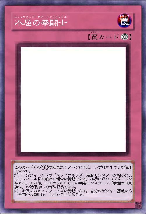 | このカード名の①②の効果は1ターンに1度、いずれか1つしか使用できない。 ①:自分フィールドの「スレイヴキッズ」融合モンスターが相手によってフィールドを離れた場合に発動できる。相手に800ダメージを与える。その後、EXデッキからその同名モンスターを「拳闘士の重訓練」の効果扱いで特殊召喚できる。 ②:お互いのメインフェイズに発動できる。自分のデッキ・墓地から「拳闘士の重訓練」1枚を手札に加える。 | |||