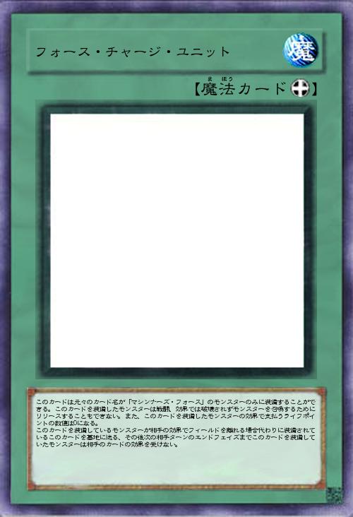 | このカードは元々のカード名が「マシンナーズ・フォース」のモンスターのみに装備することができる。このカードを装備したモンスターは戦闘、効果では破壊されずモンスターを召喚するためにリリースすることもできない。また、このカードを装備したモンスターの効果で支払うライフポイントの数値は0になる。 このカードを装備しているモンスターが相手の効果でフィールドを離れる場合代わりに装備されているこのカードを墓地に送る、その後次の相手ターンのエンドフェイズまでこのカードを装備していたモンスターは相手のカードの効果を受けない。 | |||