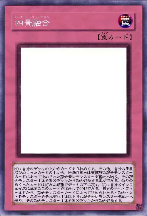 | ①:自分のデッキの上からカードを3枚めくる。その後、自分の手札及びめくったカードの中から、地属性または天使族の融合モンスターカードによって決められた融合素材モンスターを墓地へ送り、その融合モンスター1体をEXデッキから融合召喚する事ができる。残りのめくったカードは好きな順番でデッキの下に戻す。②:自分メインフェイズに墓地のこのカードを除外して発動できる。自分の手札・フィールドから、融合モンスターカードによって決められたS・融合・X・Pモンスターをそれぞれ1体以上含む融合素材モンスターを墓地へ送り、その融合モンスター1体をEXデッキから融合召喚する。 | |||