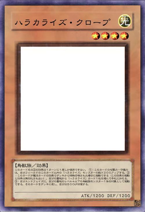 | このカード名の②の効果は1ターンに1度しか使用できない。 ①:このカードの攻撃力・守備力は、自分フィールドのこのカード以外の「ハラカライズ」モンスターの数×200アップする。②:このカードが魔法カードの効果でデッキから特殊召喚された場合に発動できる(この効果の発動と効果は無効化されない)。自分の墓地から「ハラカライズ」カード1枚を選んで手札に加える。③:自分エンドフェイズに、自分の墓地のレベル4以下の鳥獣族モンスター1体を対象として発動できる。そのカードをデッキに戻し、自分は500LP回復する。 | |||