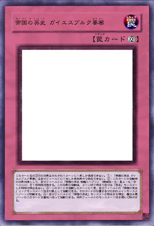 | このカード名の③④の効果はそれぞれ1ターンに1度しか使用できない。①:「帝国の英史 ガイエスブルク要塞」は自分フィールドに1枚しか表側表示で存在できない。②:このカードの発動時の効果処理として、自分フィールドに「帝国の英史 戦艦トークン」(機械族・光・星4・攻・守1000)を1体特殊召喚する。この効果の発動後、ターン終了時まで自分は「英史」モンスターしか特殊召喚出来ない。③:このカードを発動したターンに1度、自分フィールドの「帝国の英史」リンクモンスター1体を対象として発動できる。そのカードの位置を自分の別のメインモンスターゾーンに移動する。④:自分フィールドに「帝国の英史」モンスターが存在する場合、魔法&罠ゾーンのこのカードを墓地へ送って発動できる。相手フィールドのモンスター1体を選んで除外する。 | |||