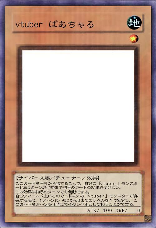 | このカードを手札から捨てることで、自分の「vtuber」モンスター1体はターン終了時まで相手のカードの効果を受けない。 この効果は相手のターンでも発動できる。 自分フィールド上にこのカード以外の「vtuber」モンスターが存在する場合、1ターンに一度2から8までのレベルを1つ宣言し、このカードをターン終了時までそのレベルとして扱うことができる。 | |||