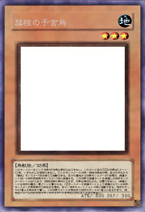 | このモンスターをリンク召喚やS召喚の素材にはできない。このカード名の①②の効果は1ターンに1度、いずれかしか使用できない。①このモンスターの召喚・特殊召喚成功時、自分の手札から「彗核」モンスター1体を捨てて発動できる。自分の墓地から効果モンスターを1体選び、装備カード扱いで相手表側表示モンスター1体に装備する。この効果で装備カードを装備した相手モンスターのレベルは1になり、特殊召喚の素材にできず、効果は無効化され、攻撃できない。(装備カードは相手の魔法・罠ゾーンに置かれる。)②モンスターを装備カードとして装備されている相手モンスターが表側表示で存在する場合、自分・相手のエンドフェイズ時に発動できる。相手のデッキの1番上を表向きで置く。この効果でカードが表向きで相手のデッキの1番上にあるかぎり、相手はドロー以外の方法でデッキからカードを手札に加えることはできない。 | |||