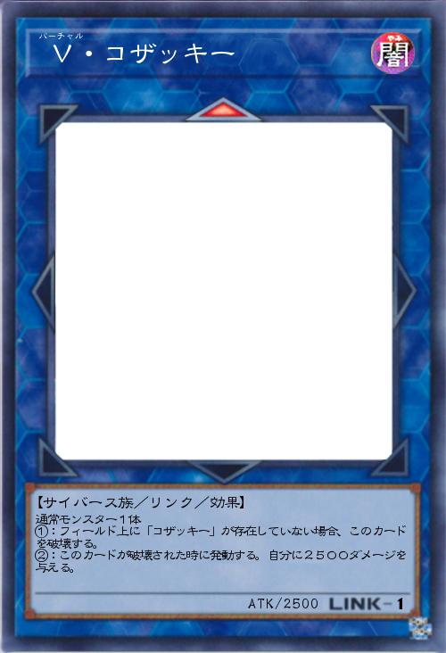 | 通常モンスター1体 ①:フィールド上に「コザッキー」が存在していない場合、このカードを破壊する。 ②:このカードが破壊された時に発動する。自分に2500ダメージを与える。 | |||