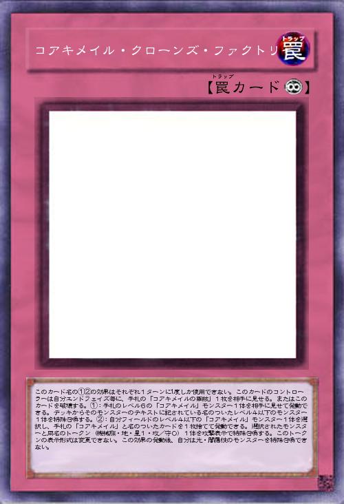 | このカード名の①②の効果はそれぞれ1ターンに1度しか使用できない。このカードのコントローラーは自分エンドフェイズ毎に、手札の「コアキメイルの鋼核」1枚を相手に見せる。またはこのカードを破壊する。①:手札のレベル6の「コアキメイル」モンスター1体を相手に見せて発動できる。デッキからそのモンスターのテキストに記されている名のついたレベル4以下のモンスター1体を特殊召喚する。②:自分フィールドのレベル4以下の「コアキメイル」モンスター1体を選択し、手札の「コアキメイル」と名のついたカードを1枚捨てて発動できる。選択されたモンスターと同名のトークン(機械族・地・星1・攻/守0)1体を攻撃表示で特殊召喚する。このトークンの表示形式は変更できない。この効果の発動後、自分は光・闇属性のモンスターを特殊召喚できない。 | |||