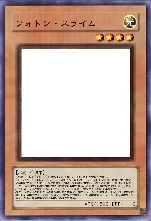 | このカード名の(1)(2)(3)の効果はそれぞれ1ターンに1度しか使用できない。 (1):自分フィールドに「フォトン・スライム」以外の「フォトン」モンスターが存在する場合に発動できる。このカードを手札から守備表示で特殊召喚する。(2):このカードが「フォトン」カードの効果で特殊召喚に成功した場合に発動できる。このカードの攻撃力は500アップする。その後、デッキからレベル4「フォトン」モンスター1体を手札に加える事ができる。(3):このカードがデッキ以外から墓地へ送られた場合に、相手フィールドの表側表示モンスター1体を対象として発動できる。そのモンスターは攻撃できない。この効果は自分フィールドに光属性Xモンスターが存在する場合にのみ発動と処理ができる。 | |||
