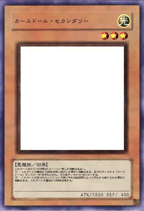 | このカード名の(1)の効果は1ターンに一度しか発動出来ない。 (1):このカードが墓地から特殊召喚に成功した場合に発動出来る。自分のデッキから「カースドール」モンスターを1枚手札に加え、その後デッキから1枚ドローする。 (2):このカードが自分のエンドフェイズ時に手札枚数制限によって手札から捨てられた場合に発動出来る。このカードを墓地から特殊召喚する。 | |||