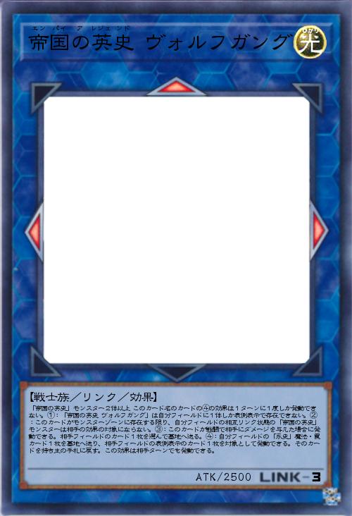 | 「帝国の英史」モンスター2体以上 このカード名のカードの④の効果は1ターンに1度しか発動できない。①:「帝国の英史 ヴォルフガング」は自分フィールドに1体しか表側表示で存在できない。②:このカードがモンスターゾーンに存在する限り、自分フィールドの相互リンク状態の「帝国の英史」モンスターは相手の効果の対象にならない。③:このカードが戦闘で相手にダメージを与えた場合に発動できる。相手フィールドのカード1枚を選んで墓地へ送る。④:自分フィールドの「永史」魔法・罠カード1枚を墓地へ送り、相手フィールドの表側表示のカード1枚を対象として発動できる。そのカードを持ち主の手札に戻す。この効果は相手ターンでも発動できる。 | |||