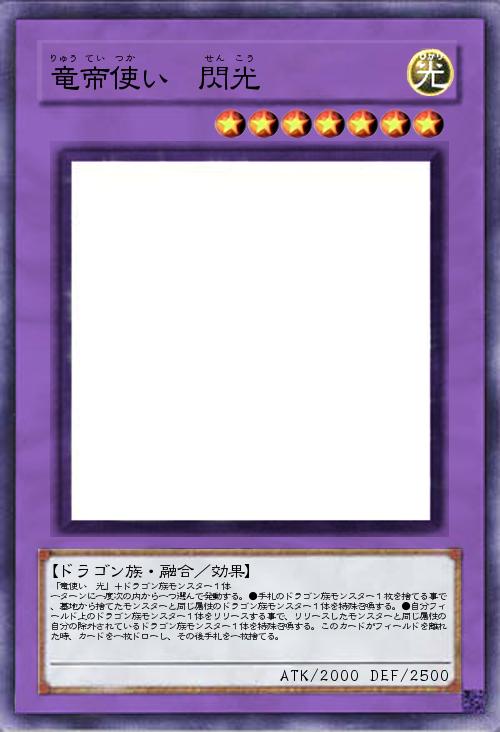 「竜使い 光」+ドラゴン族モンスター1体 一ターンに一度次の内から一つ選んで発動する。●手札のドラゴン族モンスター1枚を捨てる事で、墓地から捨てたモンスターと同じ属性のドラゴン族モンスター1体を特殊召喚する。●自分フィールド上のドラゴン族モンスター1体をリリースする事で、リリースしたモンスターと同じ属性の自分の除外されているドラゴン族モンスター1体を特殊召喚する。このカードがフィールドを離れた時、カードを一枚ドローし、その後手札を一枚捨てる。 |