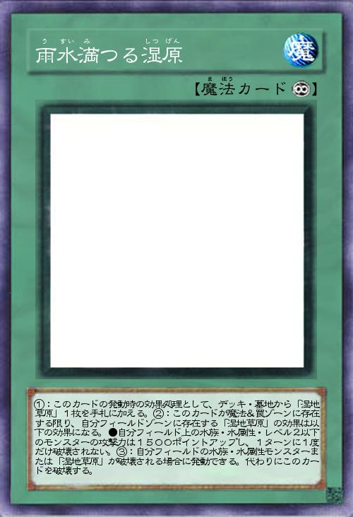 | ①:このカードの発動時の効果処理として、デッキ・墓地から「湿地草原」1枚を手札に加える。②:このカードが魔法&罠ゾーンに存在する限り、自分フィールドゾーンに存在する「湿地草原」の効果は以下の効果になる。●自分フィールド上の水族・水属性・レベル2以下のモンスターの攻撃力は1500ポイントアップし、1ターンに1度だけ破壊されない。③:自分フィールドの水族・水属性モンスターまたは「湿地草原」が破壊される場合に発動できる。代わりにこのカードを破壊する。 | |||