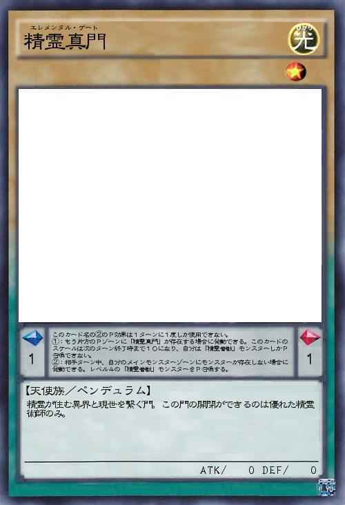 | このカード名の②のP効果は1ターンに1度しか使用できない。 ①:もう片方のPゾーンに「精霊真門」が存在する場合に発動できる。このカードのスケールは次のターン終了時まで10になり、自分は「精霊眷獣」モンスターしかP召喚できない。 ②:相手ターン中、自分のメインモンスターゾーンにモンスターが存在しない場合に発動できる。レベル4の「精霊眷獣」モンスターをP召喚する。 | |||