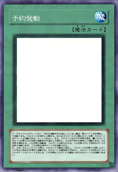 | ①:LPを2000ポイント払い、手札の発動条件を満たしていない魔法・罠カード1枚を選択して発動できる。そのカードを相手に公開する。自分はそのカードが公開されている間、そのカード名のカードを発動できず、セットできない。また、そのカードは以下の効果を得る。●このカード名のこの効果以外の効果の発動条件を満たした場合に、その他の条件を無視して発動できる。その効果を適用する。この効果の発動後、このカードは除外される。この効果に対して相手はカードの効果を発動できず、この効果は相手ターンでも発動できる。 ②:お互いのエンドフェイズ時に、このカードが墓地に存在し、このカードの効果で公開したカードが手札に存在する場合に発動する。そのカードを裏側表示で除外し、そのカードの持ち主に3000ポイントのダメージを与える。この効果はこのカードが墓地へ送られたターンには発動できない。 | |||