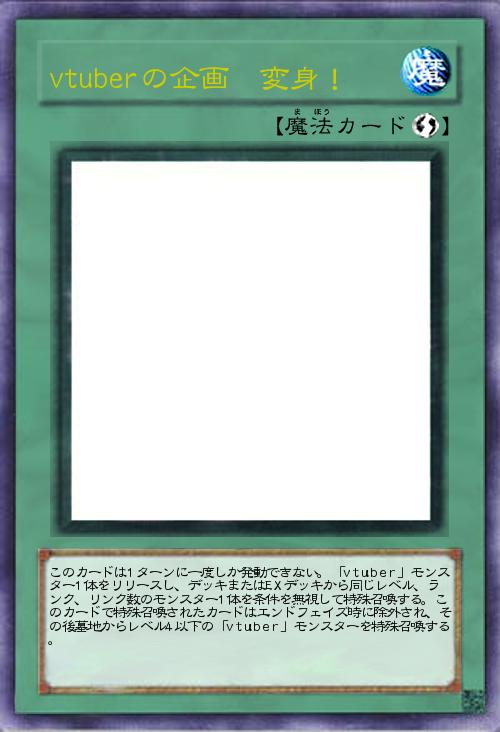 | このカードは1ターンに一度しか発動できない。「vtuber」モンスター1体をリリースし、デッキまたはEXデッキから同じレベル、ランク、リンク数のモンスター1体を条件を無視して特殊召喚する。このカードで特殊召喚されたカードはエンドフェイズ時に除外され、その後墓地からレベル4以下の「vtuber」モンスターを特殊召喚する。 | |||