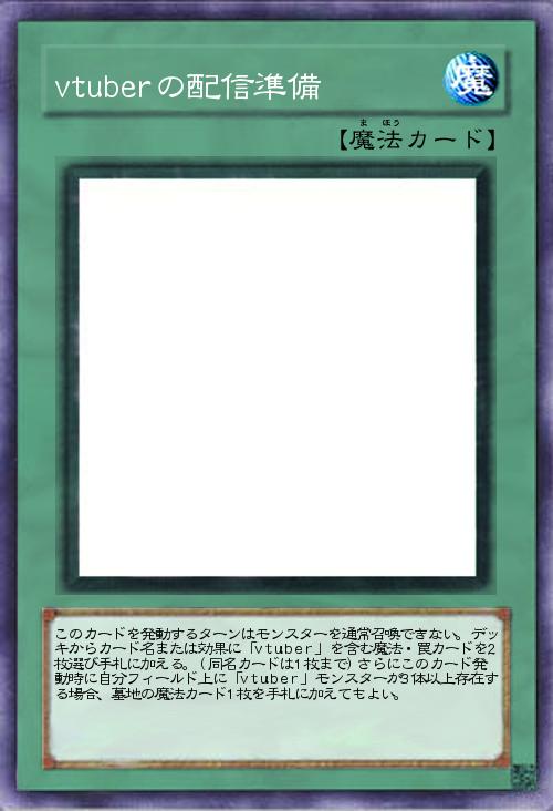 「vtuberの魔法・罠サーチです。2枚持ってこれる代わりに通常召喚できないデメリットをつけました。特殊召喚はできるので、サーチしたカードで特殊召喚!も可能です。最後の効果は嬉しいサービスとしてつけたやつです。」(2022-03-19 03:56)