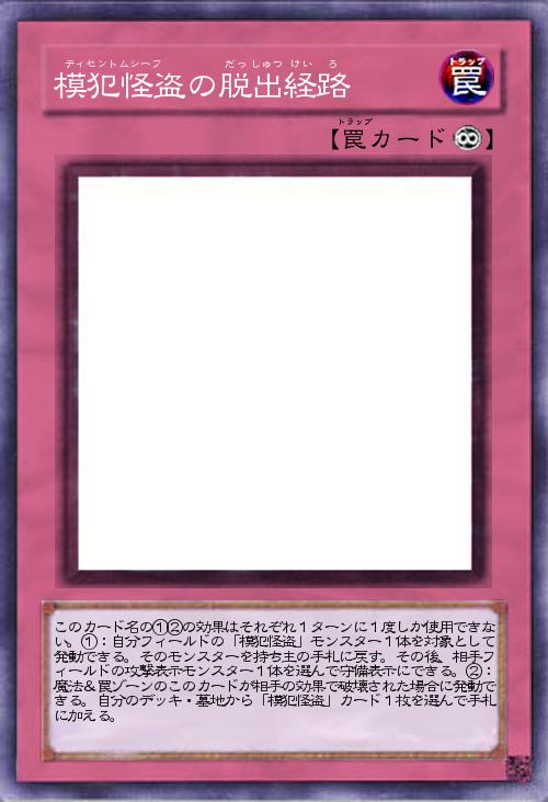 | このカード名の①②の効果はそれぞれ1ターンに1度しか使用できない。①:自分フィールドの「模犯怪盗」モンスター1体を対象として発動できる。そのモンスターを持ち主の手札に戻す。その後、相手フィールドの攻撃表示モンスター1体を選んで守備表示にできる。②:魔法&罠ゾーンのこのカードが相手の効果で破壊された場合に発動できる。自分のデッキ・墓地から「模犯怪盗」カード1枚を選んで手札に加える。 | |||