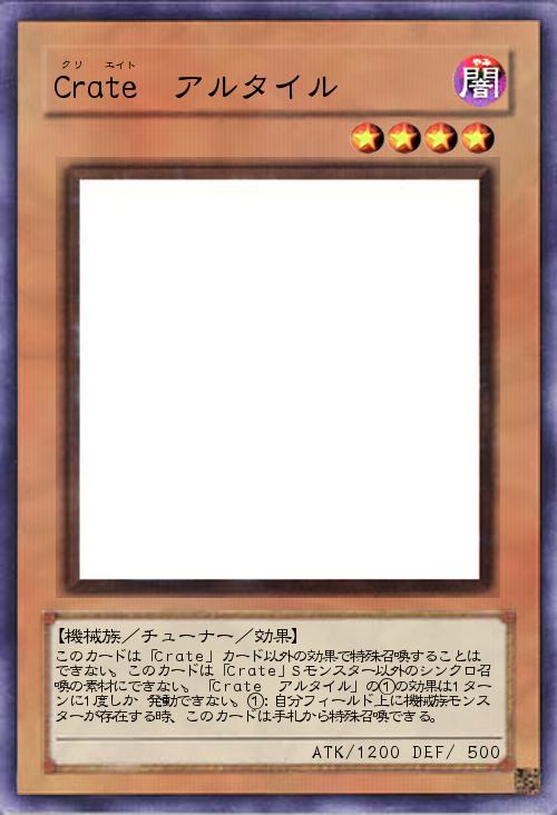 | このカードは「Crate」カード以外の効果で特殊召喚することは できない。このカードは「Crate」Sモンスター以外のシンクロ召喚の素材にできない。「Crate アルタイル」の①の効果は1ターンに1度しか 発動できない。①:自分フィールド上に機械族モンスターが存在する時、このカードは手札から特殊召喚できる。 | |||