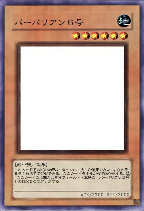 | このカード名の①の効果は1ターンに1度しか使用できない。①:手札を1枚捨てて発動できる。このカードを手札から特殊召喚する。②:このカードの攻撃力は自分フィールド・墓地の「バーバリアン2号」の数×500アップする。 | |||