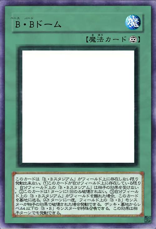 | このカードは「B・Bスタジアム」がフィールド上に存在しない限り発動出来ない。①このカードが自分フィールド上に存在している限り、自分フィールド上の「B・Bスタジアム」は相手の効果を受けない。②このカードは1ターンに1回のみ破壊されない。③自分フィールド上の「B・Bスタジアム」がフィールドを離れた場合、このカードを墓地に送る。④1ターンに一度、フィールド上の「B・B」モンスターが相手の効果で破壊された場合発動できる。デッキ・墓地からレベル4以下の「B・B」モンスターを特殊召喚できる。この効果は相手ターンでも発動できる。 | |||