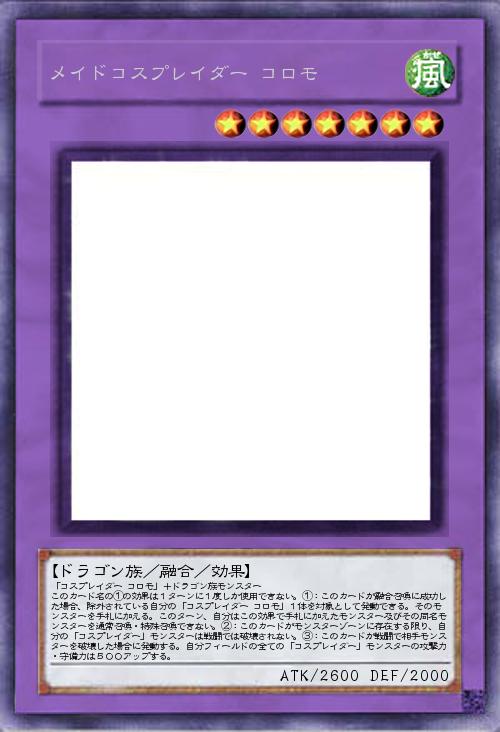| 「コスプレイダー コロモ」+ドラゴン族モンスター このカード名の①の効果は1ターンに1度しか使用できない。①:このカードが融合召喚に成功した場合、除外されている自分の「コスプレイダー コロモ」1体を対象として発動できる。そのモンスターを手札に加える。このターン、自分はこの効果で手札に加えたモンスター及びその同名モンスターを通常召喚・特殊召喚できない。②:このカードがモンスターゾーンに存在する限り、自分の「コスプレイダー」モンスターは戦闘では破壊されない。③:このカードが戦闘で相手モンスターを破壊した場合に発動する。自分フィールドの全ての「コスプレイダー」モンスターの攻撃力・守備力は500アップする。 | |||