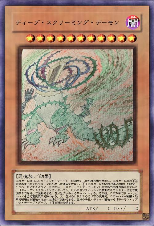 | このカードは「スクリーミング・デーモン」の効果でしか特殊召喚できない。このカード名の①②の効果はそれぞれ1ターンに1度しか使用できない。①:このカードが特殊召喚に成功した場合、100LPになるようにLPを払い、「スクリーミング・デーモン」の効果で特殊召喚されている、「ディープ・スクリーミング・デーモン」以外の自分フィールドの表側表示モンスターを全て裏側表示で除外して発動できる。自分はデッキから5枚ドローする。その後、この効果でドローしたカードを全て裏側表示で除外する。②:自分のLPが100以下の状態で、このカードが戦闘・効果で破壊され墓地へ送られた場合に発動できる。自分の手札・デッキ・墓地から「デーモン・オブ・ザ・ディープ・ダーク」1体を特殊召喚する。 | |||
