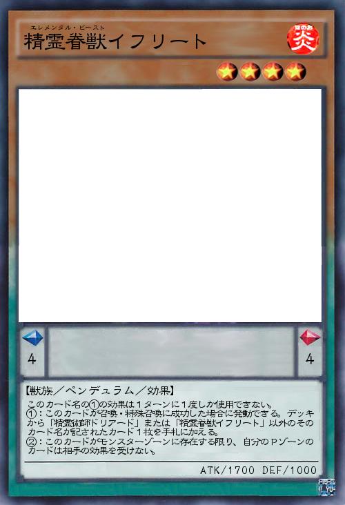 | このカード名の①の効果は1ターンに1度しか使用できない。 ①:このカードが召喚・特殊召喚に成功した場合に発動できる。デッキから「精霊術師ドリアード」または「精霊眷獣イフリート」以外のそのカード名が記されたカード1枚を手札に加える。 ②:このカードがモンスターゾーンに存在する限り、自分のPゾーンのカードは相手の効果を受けない。 | |||
