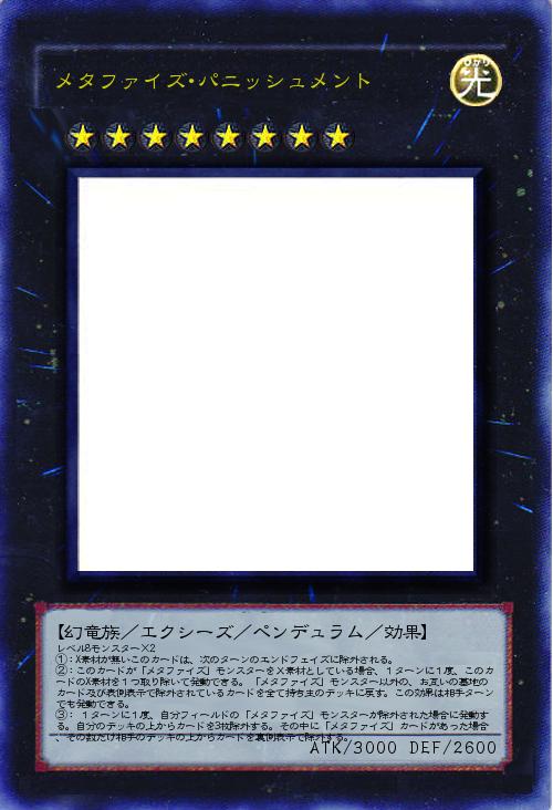| レベル8モンスター×2 ①:X素材が無いこのカードは、次のターンのエンドフェイズに除外される。 ②:このカードが「メタファイズ」モンスターをX素材としている場合、1ターンに1度、このカードのX素材を1つ取り除いて発動できる。「メタファイズ」モンスター以外の、お互いの墓地のカード及び表側表示で除外されているカードを全て持ち主のデッキに戻す。この効果は相手ターンでも発動できる。 ③: 1ターンに1度、自分フィールドの「メタファイズ」モンスターが除外された場合に発動する。自分のデッキの上からカードを3枚除外する。その中に「メタファイズ」カードがあった場合、その数だけ相手のデッキの上からカードを裏側表示で除外する。 | |||