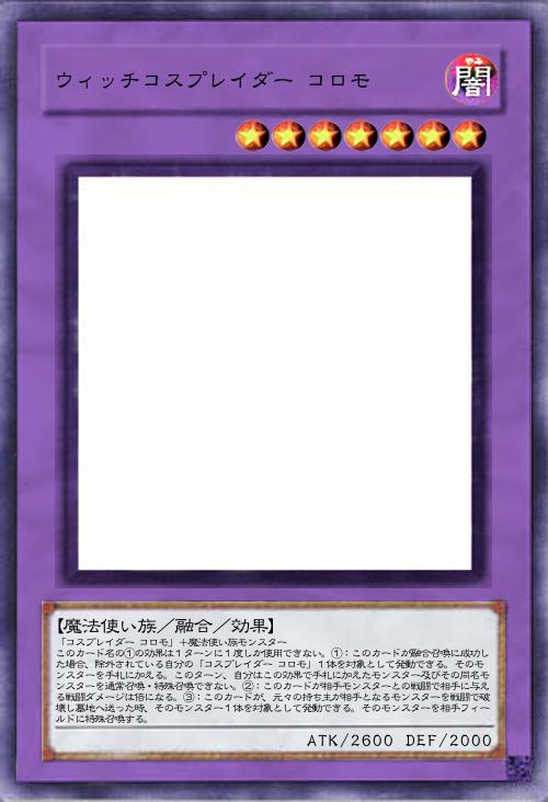 | 「コスプレイダー コロモ」+魔法使い族モンスター このカード名の①の効果は1ターンに1度しか使用できない。①:このカードが融合召喚に成功した場合、除外されている自分の「コスプレイダー コロモ」1体を対象として発動できる。そのモンスターを手札に加える。このターン、自分はこの効果で手札に加えたモンスター及びその同名モンスターを通常召喚・特殊召喚できない。②:このカードが相手モンスターとの戦闘で相手に与える戦闘ダメージは倍になる。③:このカードが、元々の持ち主が相手となるモンスターを戦闘で破壊し墓地へ送った時、そのモンスター1体を対象として発動できる。そのモンスターを相手フィールドに特殊召喚する。 | |||
